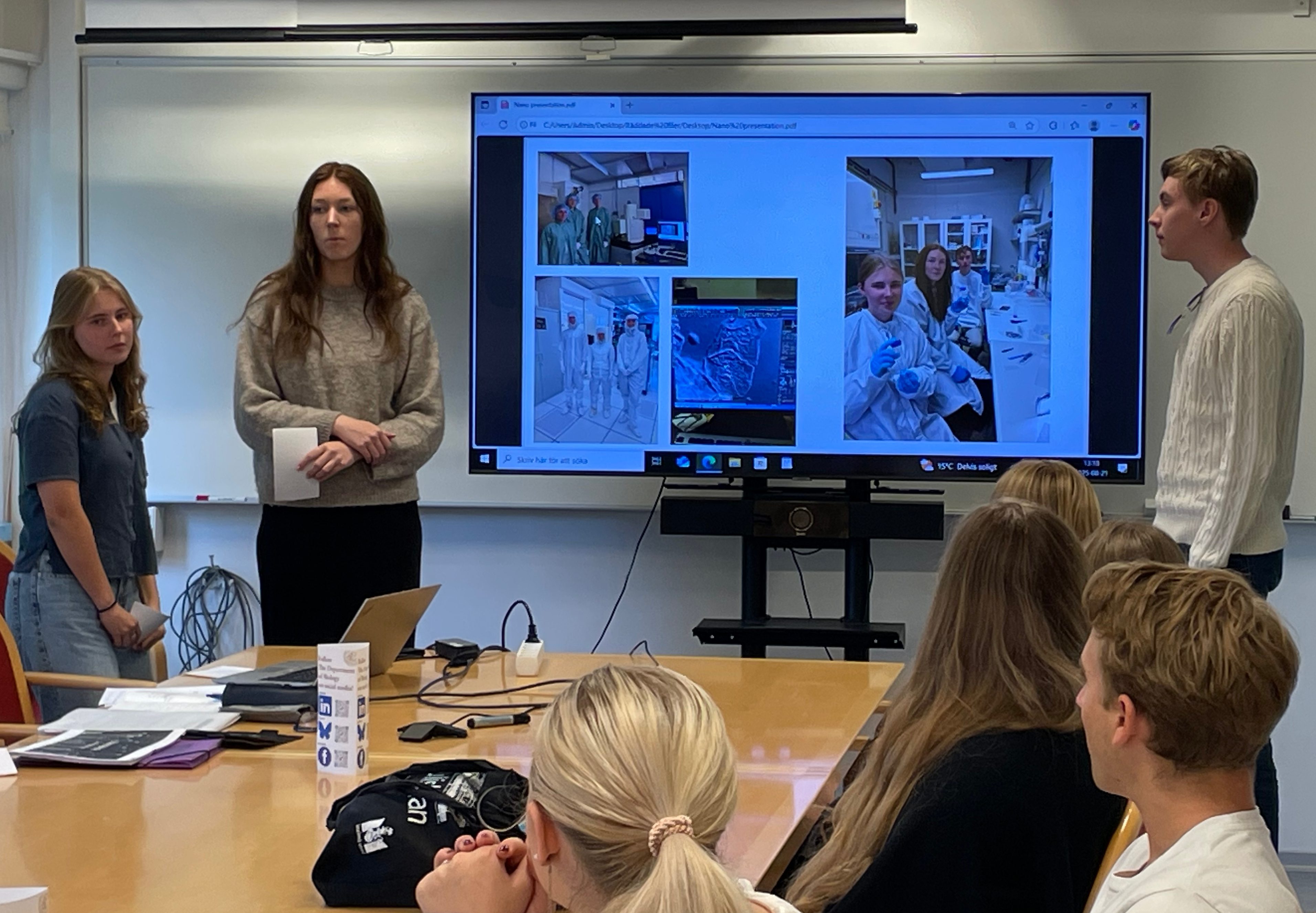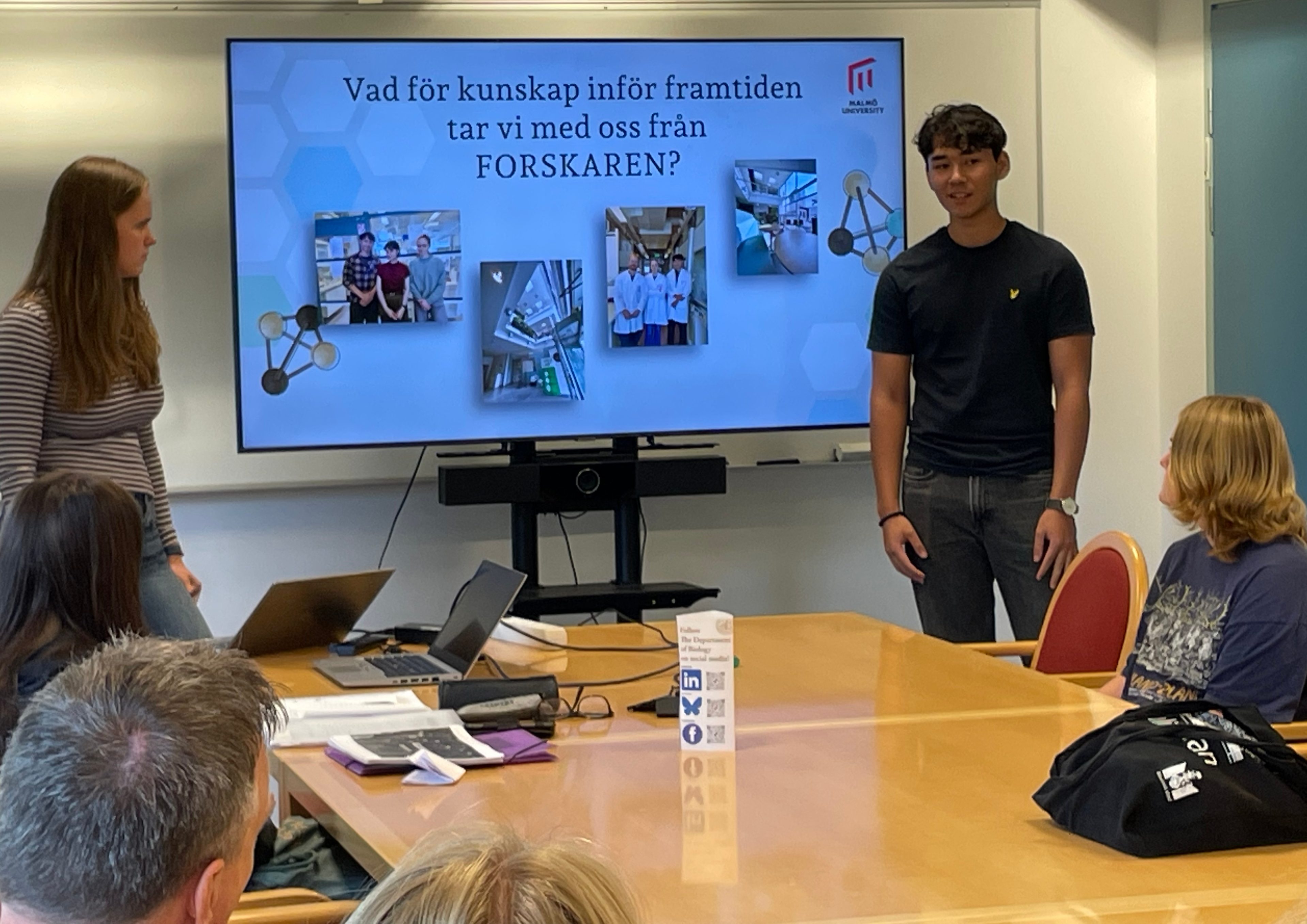 Vaiva Urbonaite, Tycho Brahe, och Carl Johansson, HTS, hade tillbringat sina två lovveckor på Hälsa och Samhälle på Malmö universitet. Där hade de fått stifta bekantskap med en lång rad metoder och tekniker för forskning inom bl a det medicinska området med delvis kryptiska beteckningar (som de redde ut): rSAMS, IRAS, NMR, Williamson Ether Reaction, masspektrometri, tunnskiktskromatografi, m fl (det finns inte utrymme att förklara vad allt detta är – den invigda förstår att det rörde sig om en intressant agenda, vi andra får gå till Wikipedia eller Nationalencyklopedin). Tillämpningar som solceller och biosensorer hade varit på tapeten, förutom de medicinska.