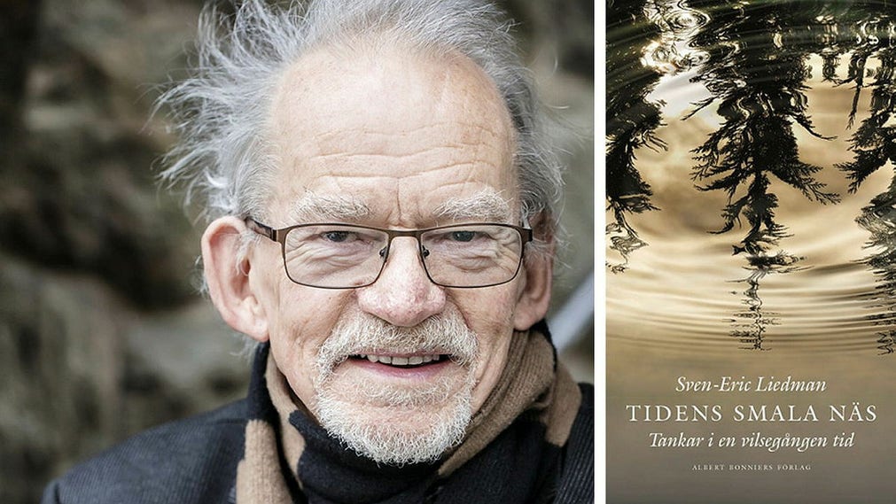 Vinjettbilden: Sven-Eric Liedman tillsammans med omslaget på en av hans senaste böcker, Tidens smala näs, tankar i en vilsegången tid (Albert Bonniers Förlag, 2024).