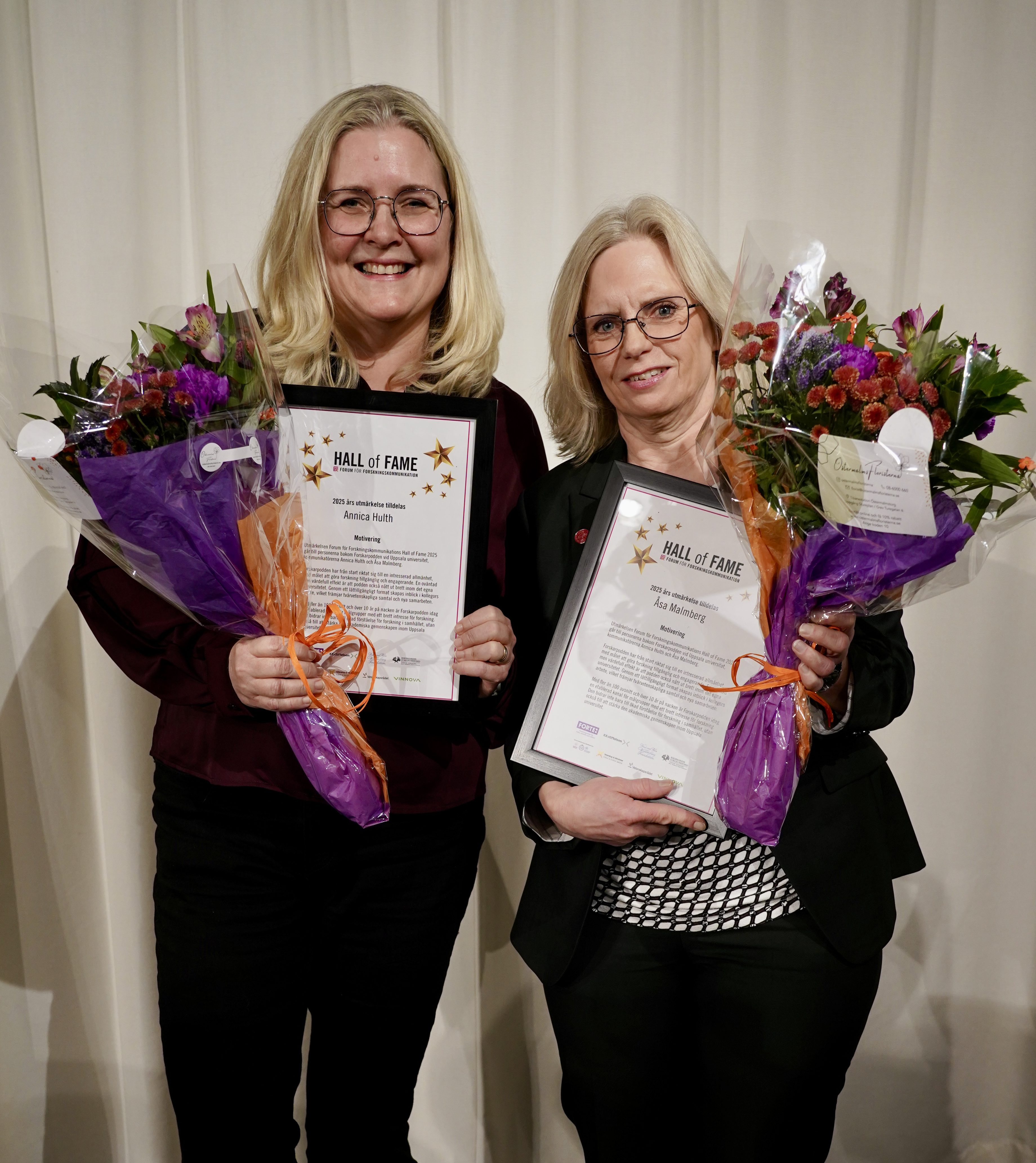 Annica Hulth och Åsa Malmberg (vinjettbilden) står bakom Forskarpodden från Uppsala universitet som funnits ett decennium. För sin insats fick de igår (19 november 2025) en plats i den ”Hall of Fame” för forskningskommunikation som öppnade förra året. FORSKNINGSNÄTET gratulerar!